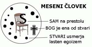 Mesen človek vrže s prestola Boga in se sam usede nanj. Bog postane ena od stvari, ki vse služijo človeku glede na njegove potrebe, glede na to, kar on misli, da je prav. Tak način je sicer privlačen (dinamičen, razgiban, vse je pod kontrolo, …), vendar vodi v nezadovoljstvo in frustracije. Težava je v samem vrednotenju stvari: enim pripisujemo večjo težo, drugim manjšo, po lastni presoji in pameti, po lastnem omejenem vedenju, ki se lahko tudi moti.